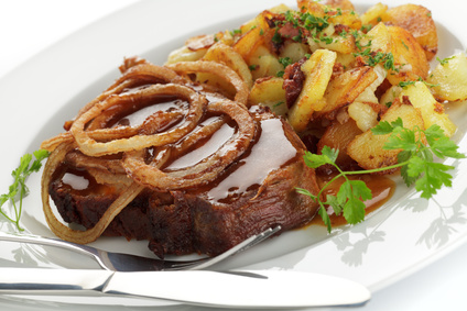 und Zwiebeln, dazu Apfelrotkohl und Bratkartoffeln