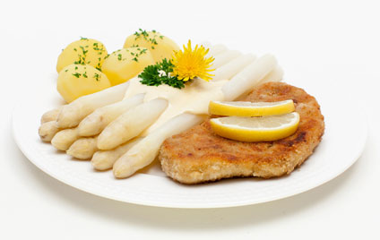 Schnitzel vom Schwein oder Hähnchenbrustfilet mit frischem Spargel und Hollandaise überbacken, dazu reichen wir einen frischen Salat und Salzkartoffeln