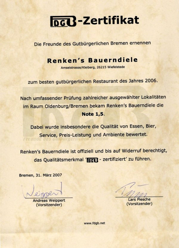 Seit dem erfreuen sich die Gäste von “Renken`s Bauerndiele” an original Ammerländer Küche in neuer und traditioneller Art & Weise.